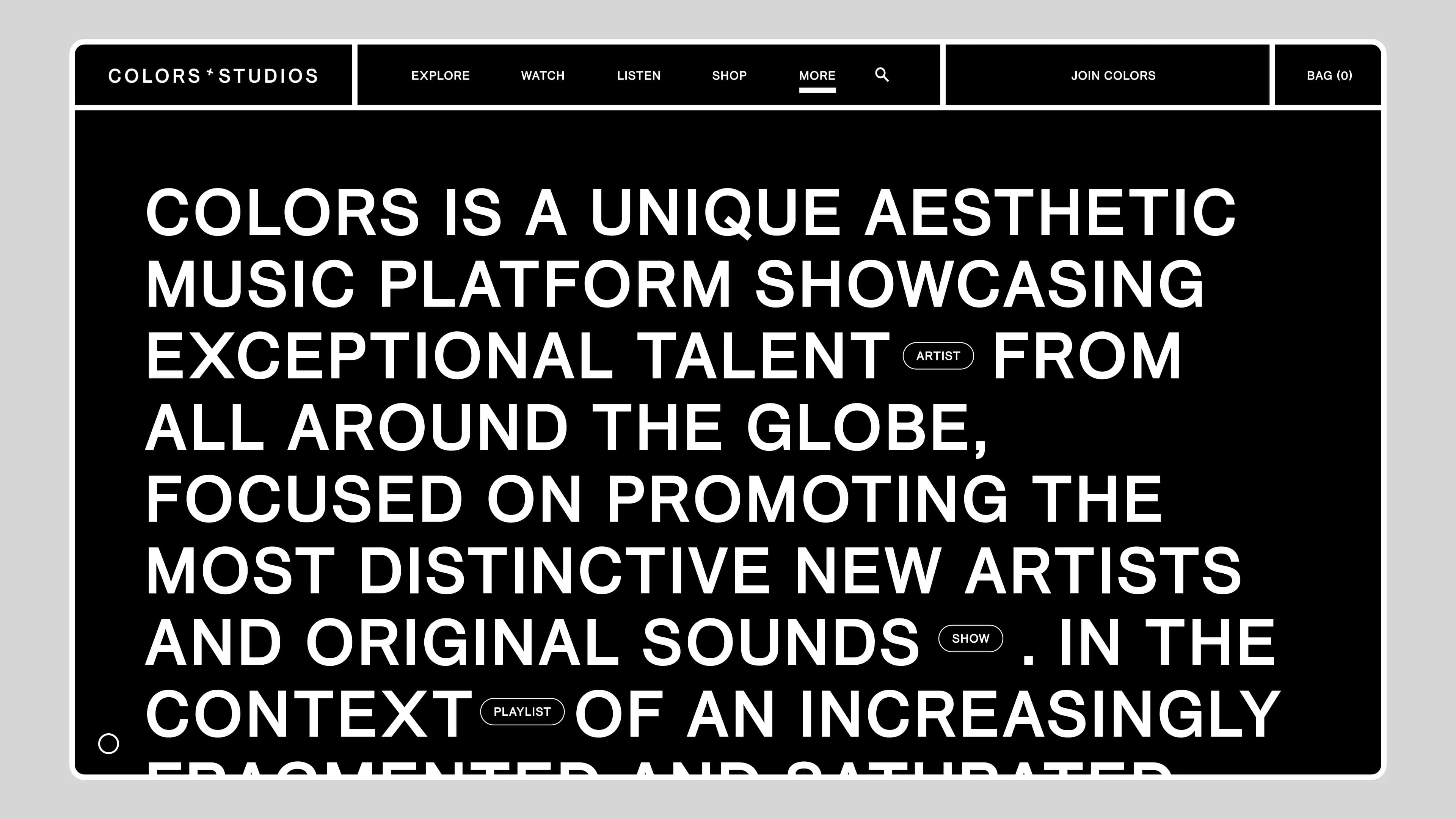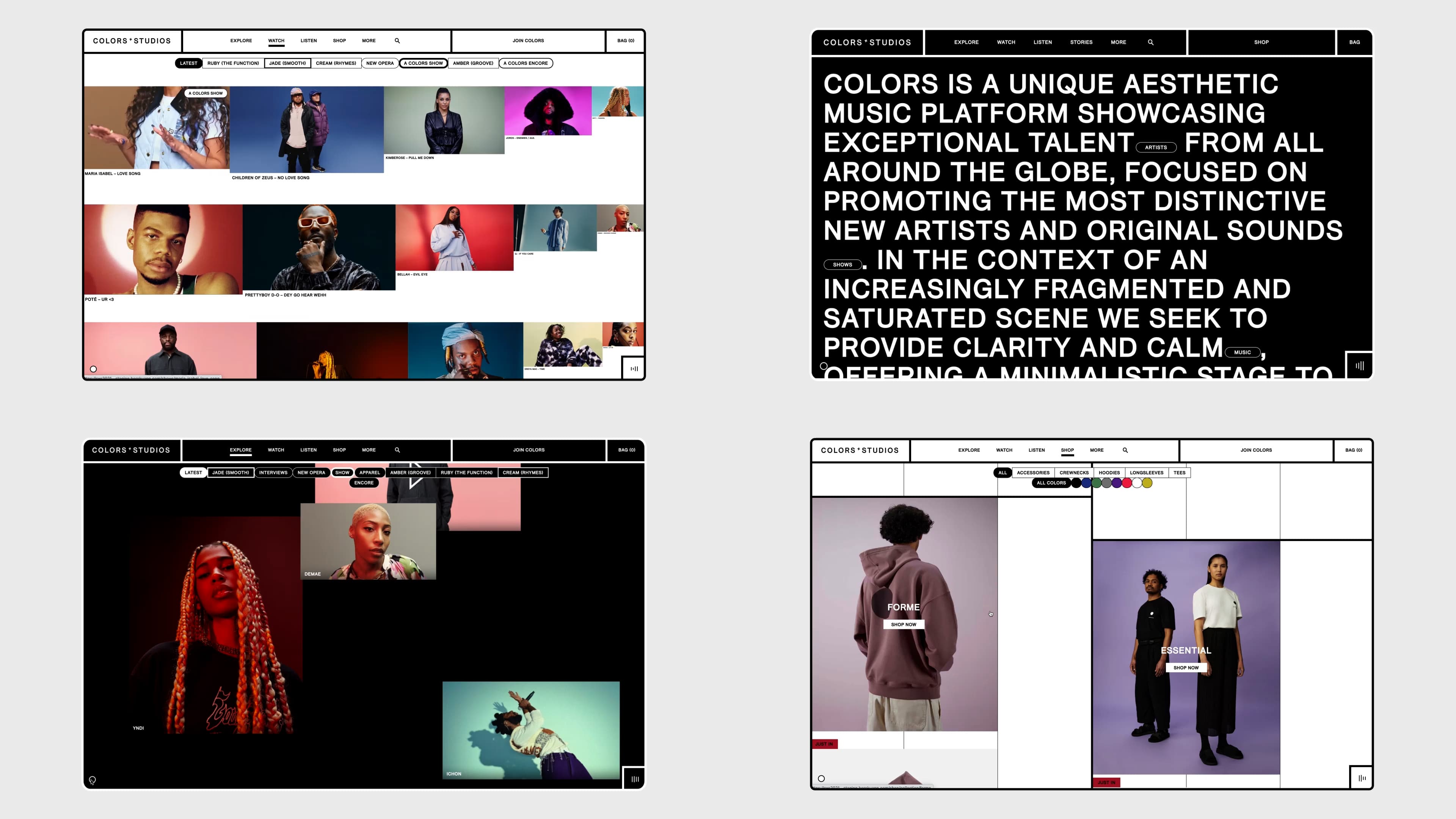 A sense of taste and contemporary music understanding that transcends conventional boundaries, COLORS is a unique aesthetic music platform that showcases exceptional talent from around the globe, focused on promoting the most distinctive new artists and original sounds.